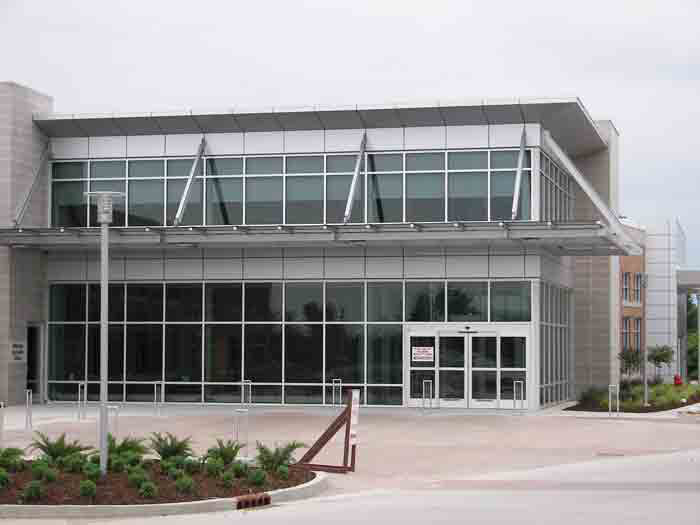 The custom L-shaped aluminum glass canopy is approximately 56 ft wide x 13 ft. 6 in. projection on the east elevation of the building. Plus, 19 ft. 6 in. wide x 7 ft. 7 1/2 in. projection on the north elevation of the building. Clear annealed laminated glass supported by 3 in. x 3 in. aluminum tubing.
